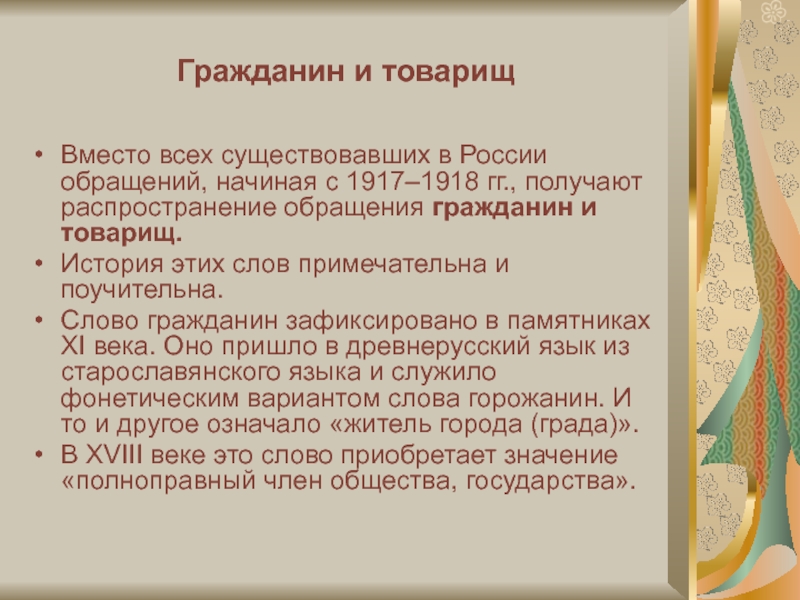 В XVIII веке это слово приобретает значение «полноправный член общества, государства».