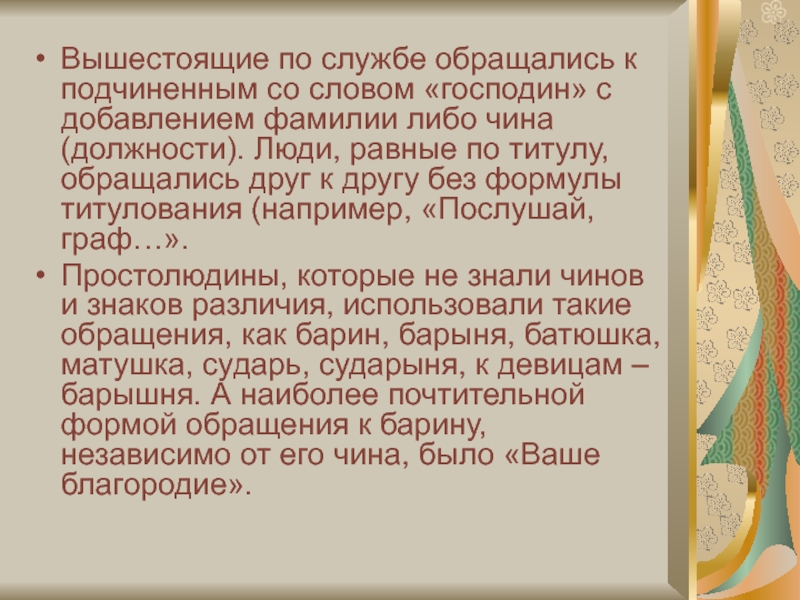 Слайд 9Вышестоящие по службе обращались к подчиненным со словом «господин» с добавлением