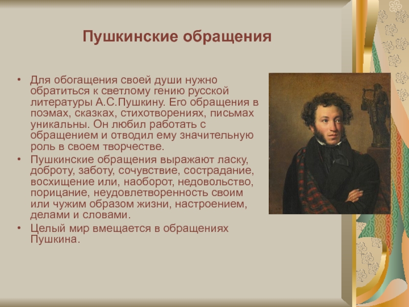 литературы А.С.Пушкину. Его обращения в поэмах, сказках, стихотворениях, письмах уникальны. Он любил работать с обращением и отводил ему значительную роль в своем творчестве.