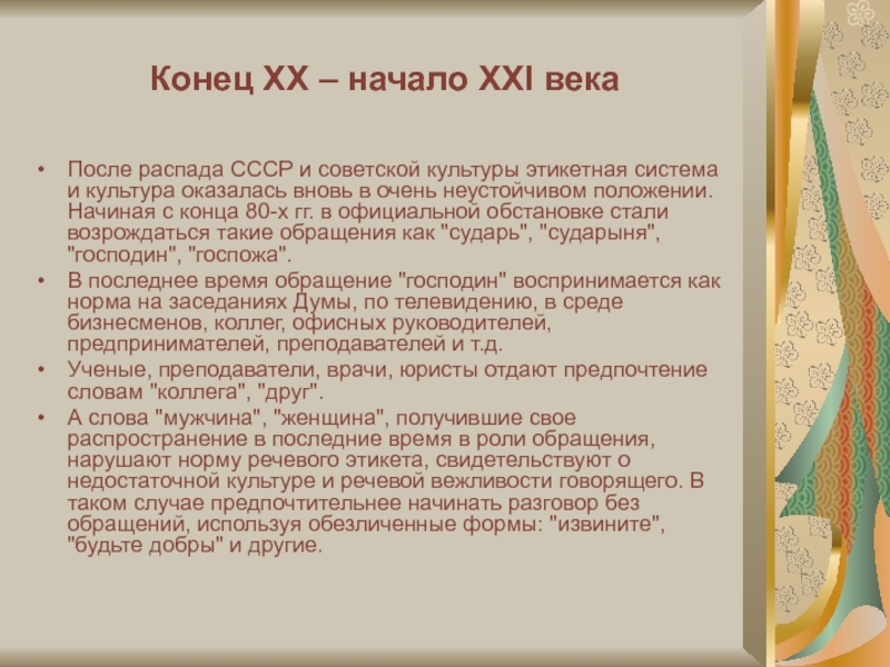 этикетная система и культура оказалась вновь в очень неустойчивом положении. Начиная с конца 80-х гг. в официальной обстановке стали возрождаться такие обращения как "сударь", "сударыня", "господин", "госпожа".