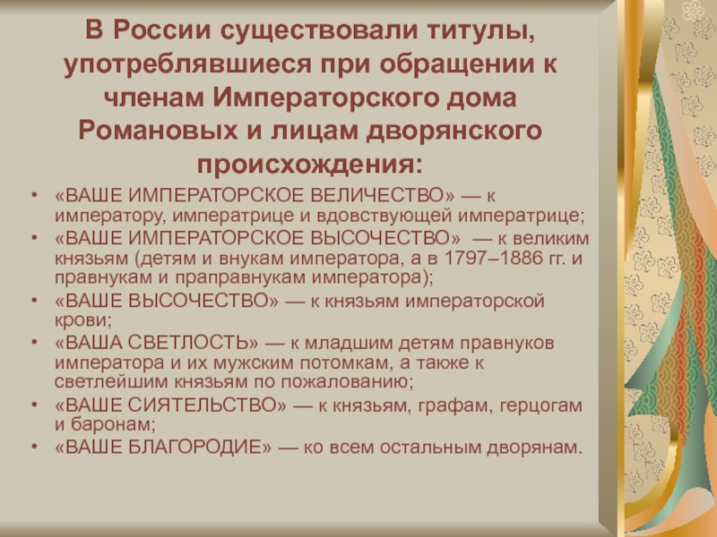 В России существовали титулы, употреблявшиеся при обращении к членам Императорского дома
