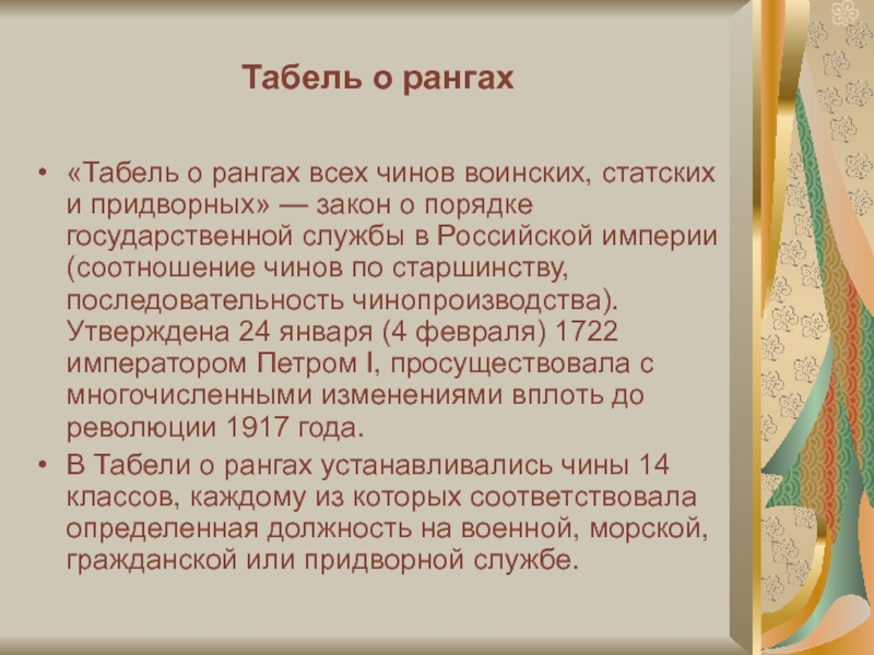 В Табели о рангах устанавливались чины 14 классов, каждому из которых соответствовала определенная должность на военной, морской, гражданской или придворной службе.