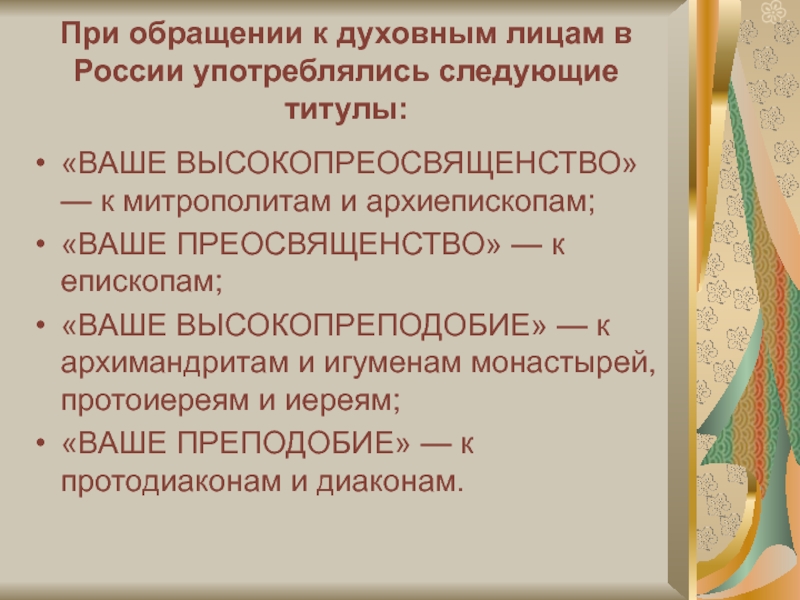 Слайд 15При обращении к духовным лицам в России употреблялись следующие титулы: