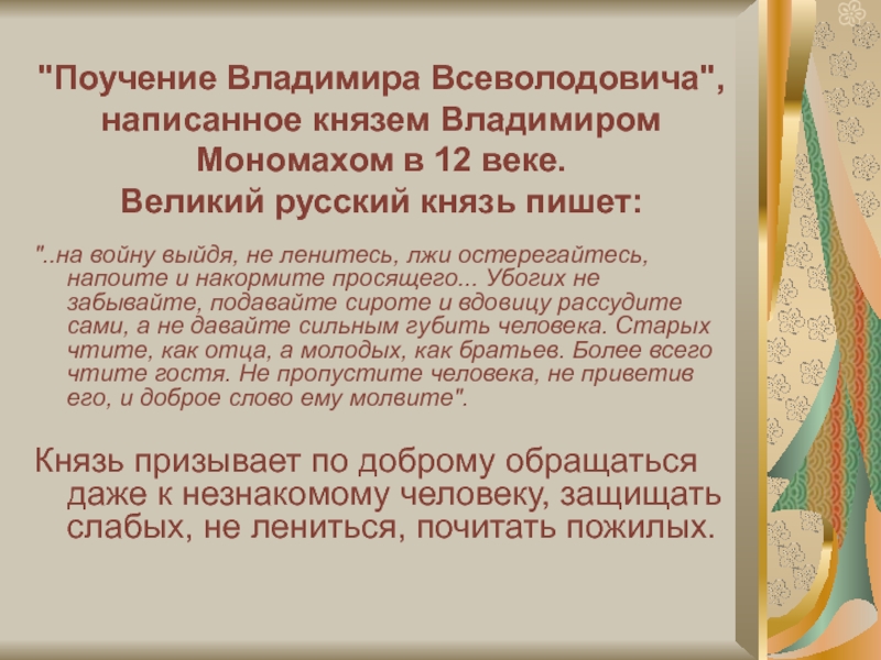 Князь призывает по доброму обращаться даже к незнакомому человеку, защищать слабых, не лениться, почитать пожилых.
