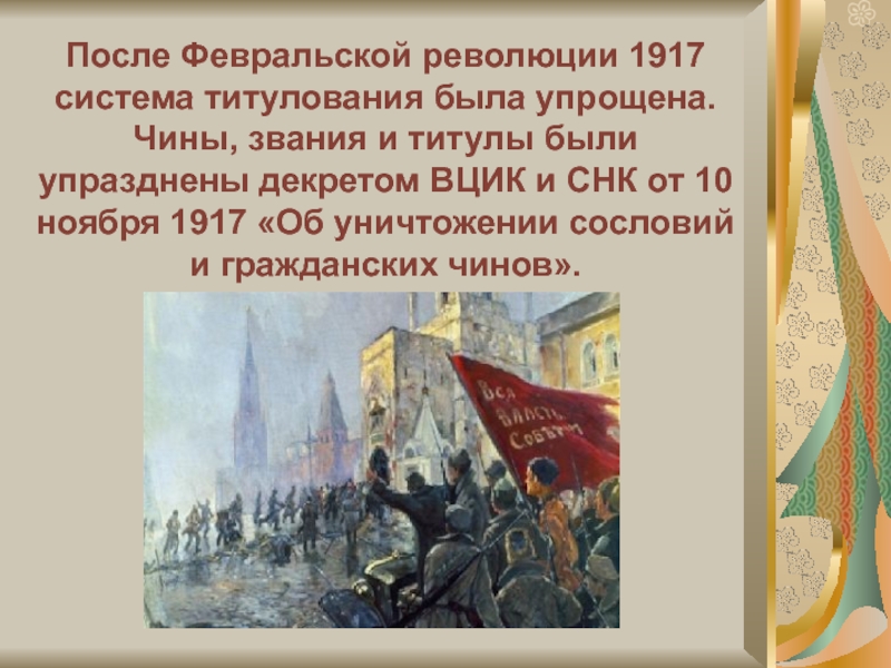 После Февральской революции 1917 система титулования была упрощена. Чины, звания и