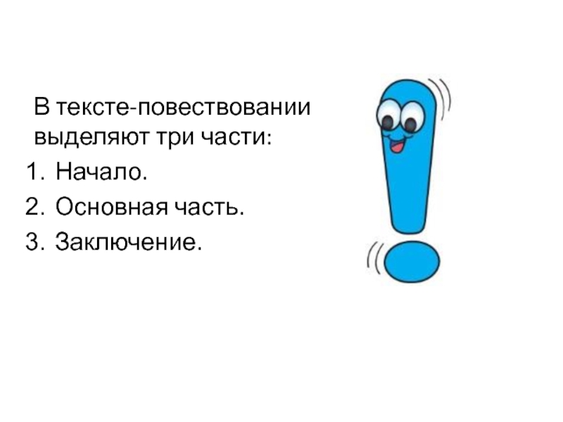 В тексте-повествовании выделяют три части:Начало.Основная часть.Заключение.