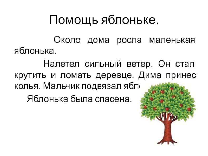 Помощь яблоньке.   Около дома росла маленькая яблонька.    Налетел сильный ветер. Он стал