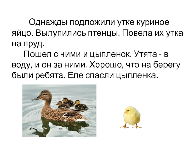 Однажды подложили утке куриное яйцо. Вылупились птенцы. Повела их утка на пруд. Пошел с ними и цыпленок. Утята - в воду, и он за ними. Хорошо, что на