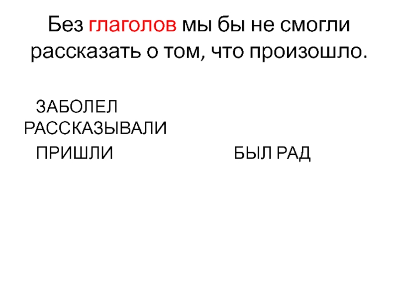 Слайд 10Без глаголов мы бы не смогли рассказать о том, что произошло.