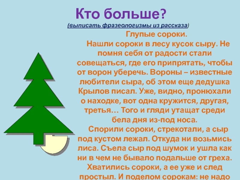 Спорили сороки, стрекотали, а сыр под кустом лежал. Откуда ни возьмись лиса. Съела сыр под шумок и ушла как ни в чем не бывало подальше от греха. Хватились сороки, а ее уже и след простыл. И поделом сорокам: не надо было ворон считать!