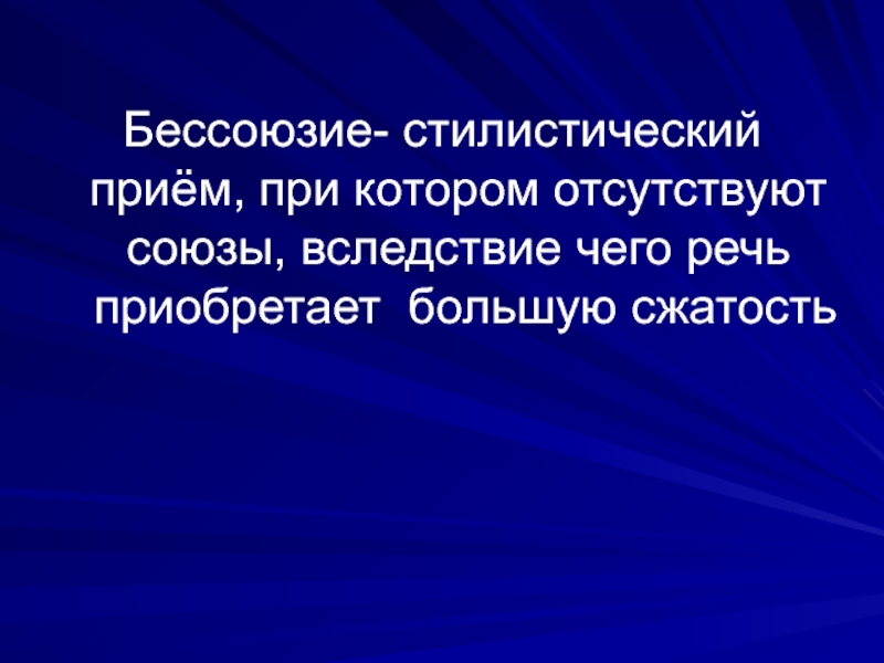 Слайд 19Бессоюзие- стилистический приём, при котором отсутствуют союзы, вследствие чего речь приобретает