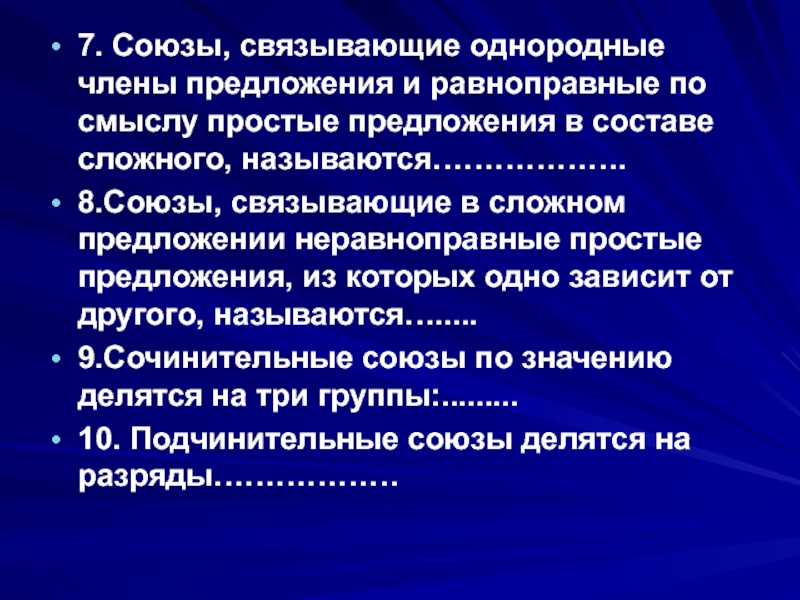 8.Союзы, связывающие в сложном предложении неравноправные простые предложения, из которых одно зависит от другого, называются….....