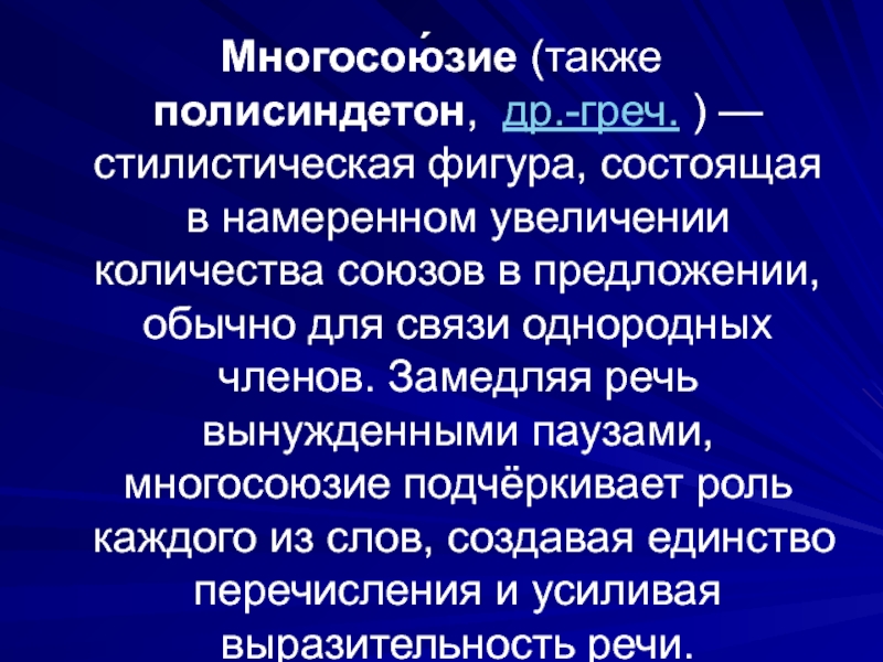 Слайд 17Многосою́зие (также полисиндетон, др.-греч. ) — стилистическая фигура, состоящая в намеренном увеличении