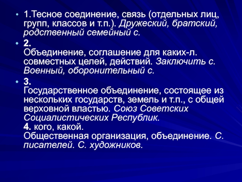 Слайд 61.Тесное соединение, связь (отдельных лиц, групп, классов и т.п.). Дружеский, братский,