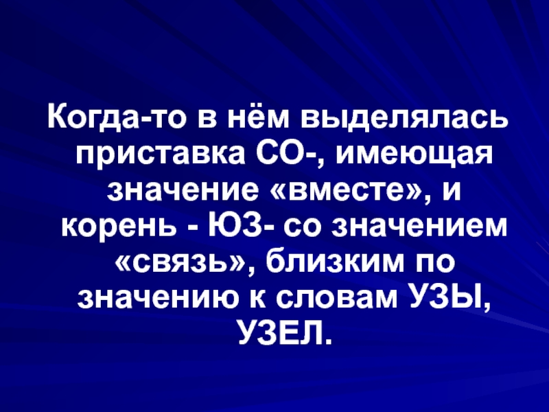 Слайд 8 Когда-то в нём выделялась приставка СО-, имеющая значение «вместе», и