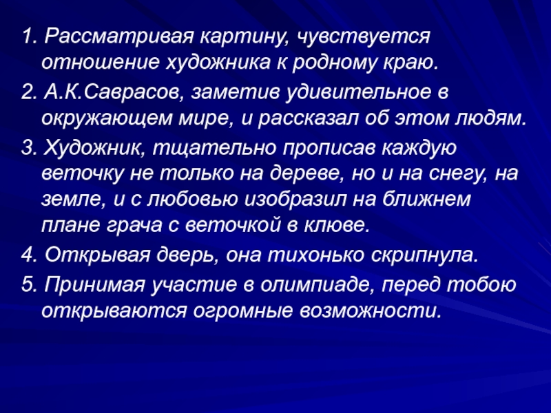 Слайд 211. Грачи радостно и громко провозглашают о приходе весны. 2. Хотя
