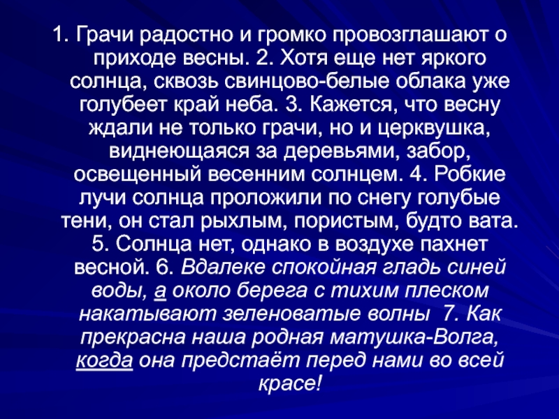 еще нет яркого солнца, сквозь свинцово-белые облака уже голубеет край неба. 3. Кажется, что весну ждали не только грачи, но и церквушка, виднеющаяся за деревьями, забор, освещенный весенним солнцем. 4. Робкие лучи солнца проложили по снегу голубые тени, он стал рыхлым, пористым, будто вата. 5. Солнца нет, однако в воздухе пахнет весной. 6. Вдалеке спокойная гладь синей воды, а около берега с тихим плеском накатывают зеленоватые волны 7. Как прекрасна наша родная матушка-Волга, когда она предстаёт перед нами во всей красе!
