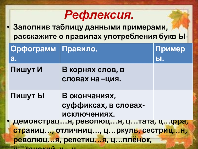 Заполнив таблицу данными примерами, расскажите о правилах употребления букв Ы-И после