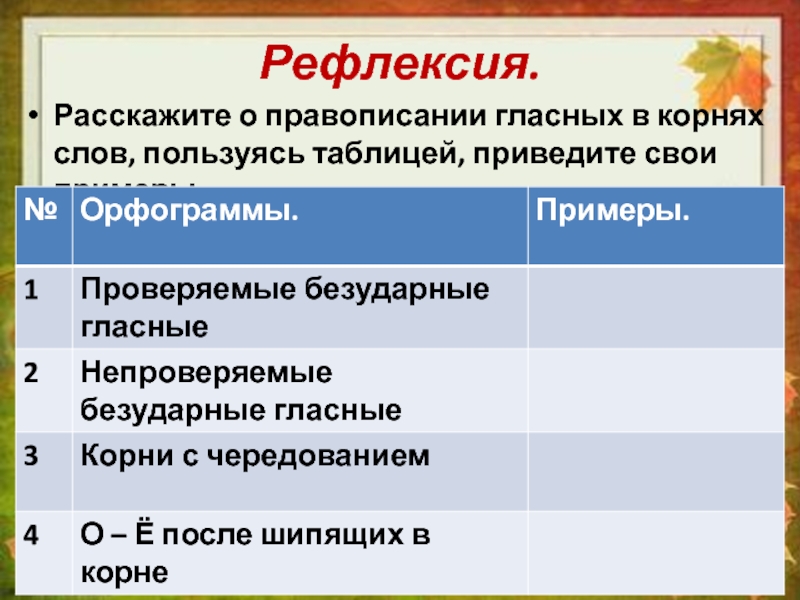 Расскажите о правописании гласных в корнях слов, пользуясь таблицей, приведите свои