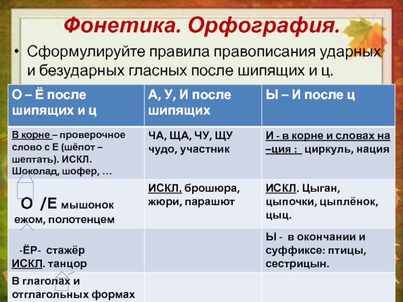 Сформулируйте правила правописания ударных и безударных гласных после шипящих и