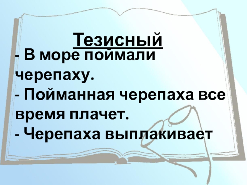 Тезисный- В море поймали черепаху. - Пойманная черепаха все время плачет. - Черепаха выплакивает