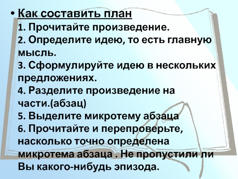 Слайд 5Как составить план 1. Прочитайте произведение. 2. Определите идею, то есть главную мысль. 3.