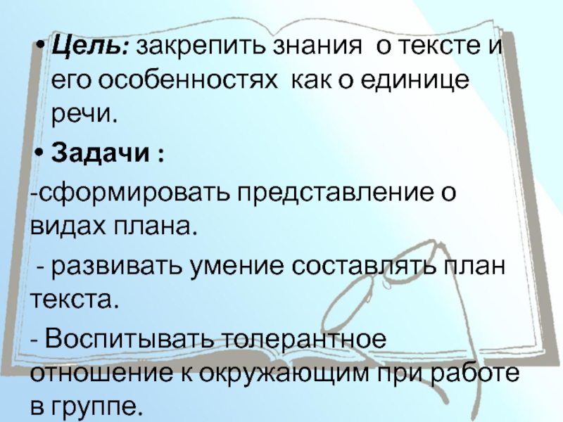 Цель: закрепить знания о тексте и его особенностях как о единице речи. Задачи :-сформировать представление о видах