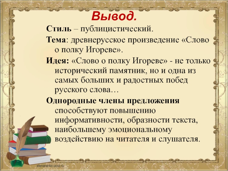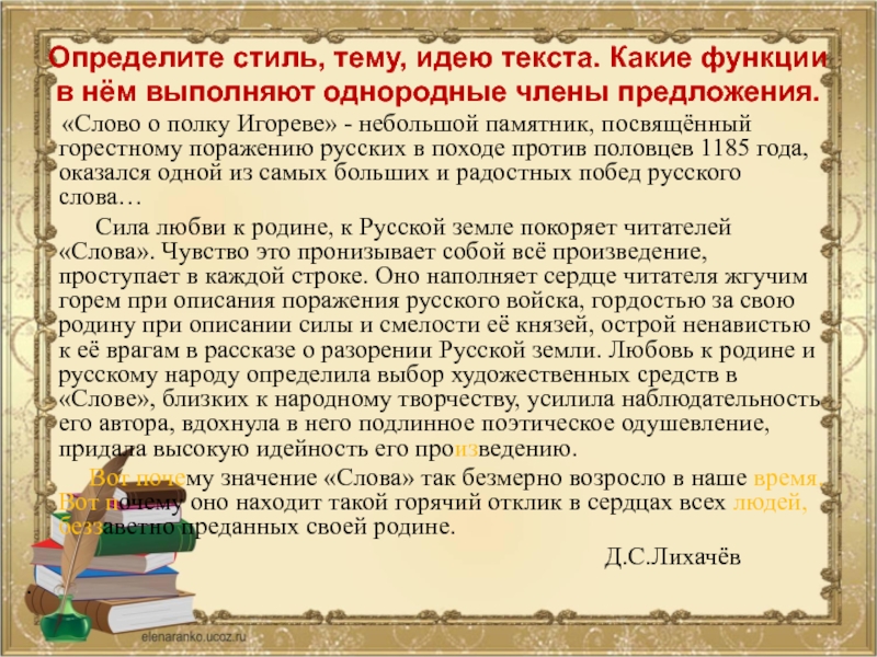 Слайд 15Определите стиль, тему, идею текста. Какие функции в нём выполняют однородные