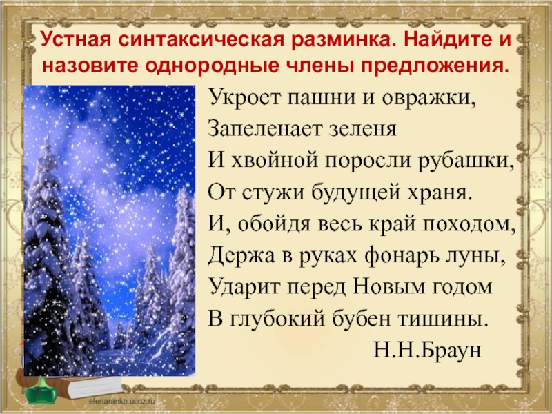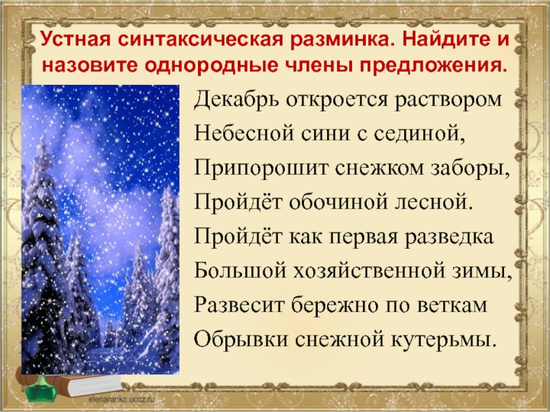 Слайд 6Устная синтаксическая разминка. Найдите и назовите однородные члены предложения.
