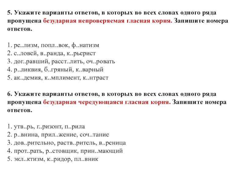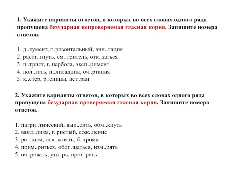 2. Укажите варианты ответов, в которых во всех словах одного ряда пропущена безударная проверяемая гласная корня. Запишите номера ответов.
