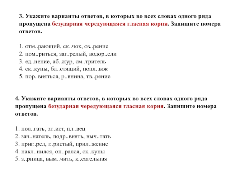 4. Укажите варианты ответов, в которых во всех словах одного ряда пропущена безударная чередующаяся гласная корня. Запишите номера ответов.