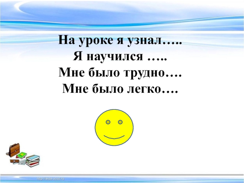 На уроке я узнал…..Я научился …..Мне было трудно…. Мне было легко….