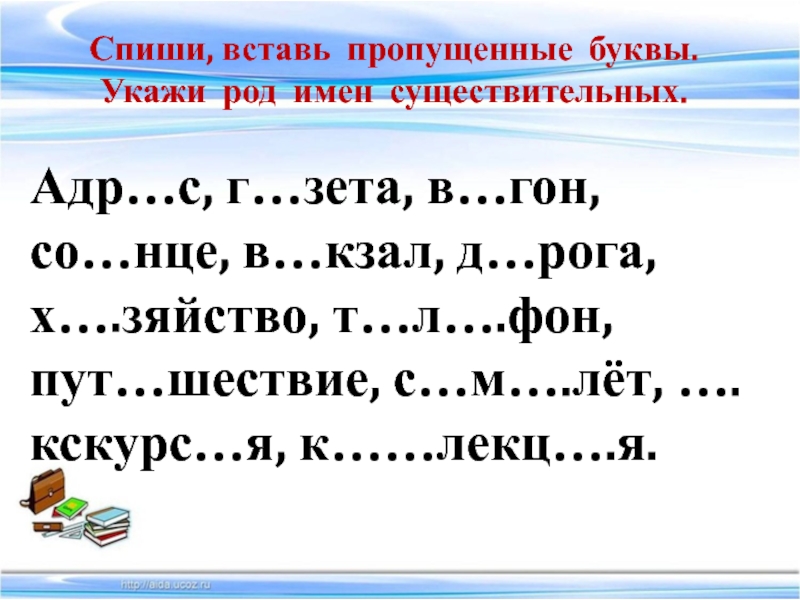 Спиши, вставь пропущенные буквы. Укажи род имен существительных.Адр…с, г…зета, в…гон, со…нце, в…кзал, д…рога, х….зяйство, т…л….фон, пут…шествие, с…м….лёт,