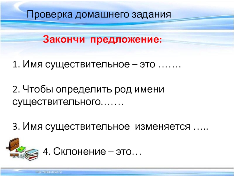 Проверка домашнего задания       Закончи предложение:1. Имя существительное –