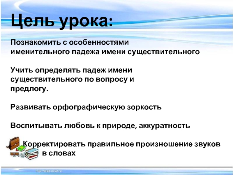 Цель урока:Познакомить с особенностямиименительного падежа имени существительногоУчить определять падеж именисуществительного по вопросу ипредлогу.Развивать орфографическую зоркостьВоспитывать любовь к