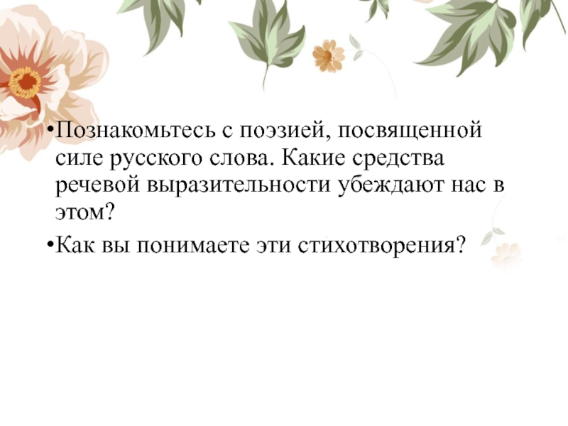 Познакомьтесь с поэзией, посвященной силе русского слова. Какие средства речевой выразительности убеждают нас в этом?Как вы понимаете эти стихотворения?