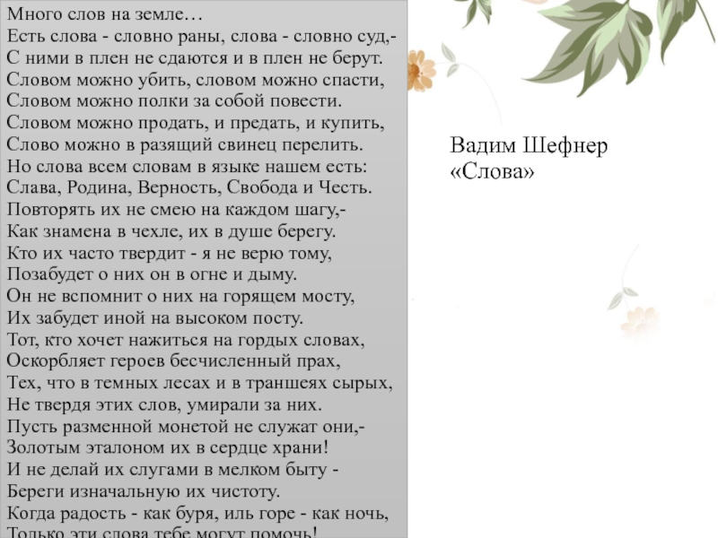 Вадим Шефнер «Слова»Много слов на земле… Есть слова - словно раны, слова - словно суд,- С ними