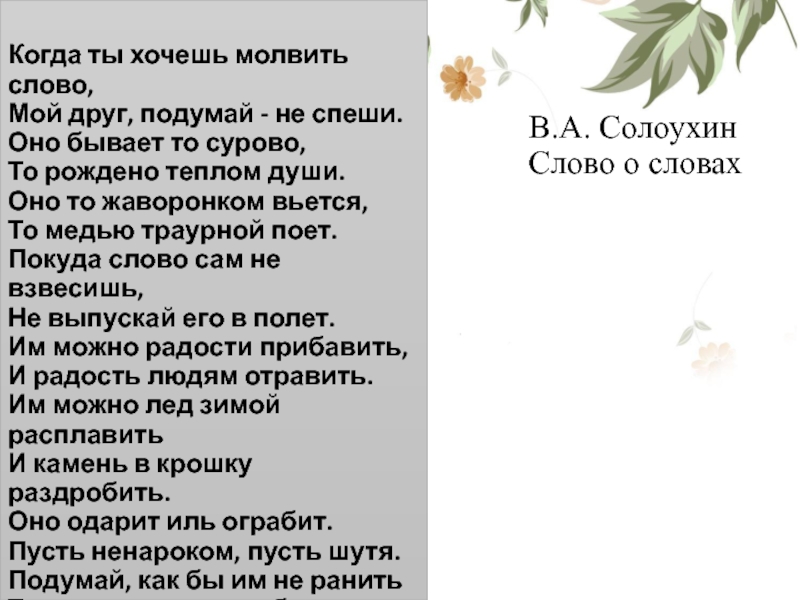 В.А. Солоухин Слово о словахКогда ты хочешь молвить слово, Мой друг, подумай - не спеши. Оно бывает
