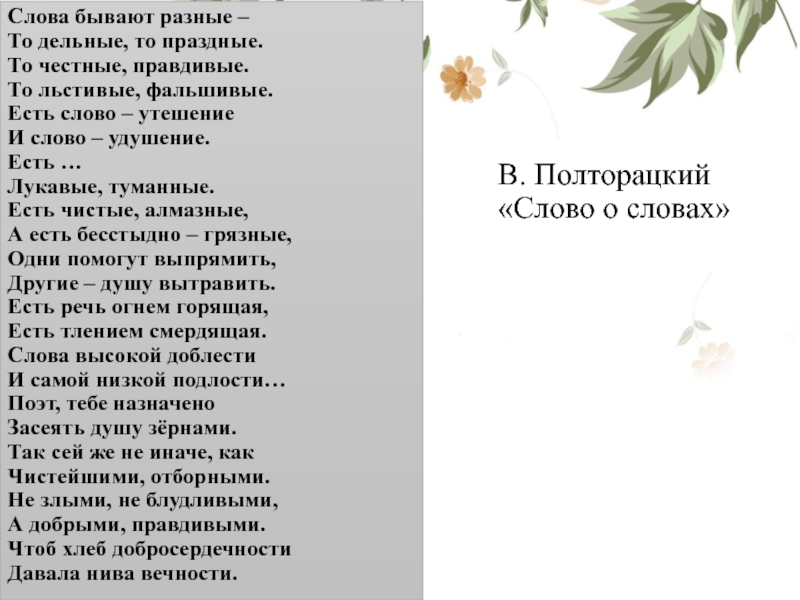 В. Полторацкий «Слово о словах»Слова бывают разные – То дельные, то праздные. То честные, правдивые. То льстивые,