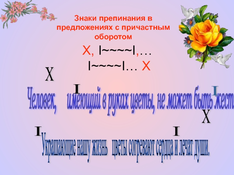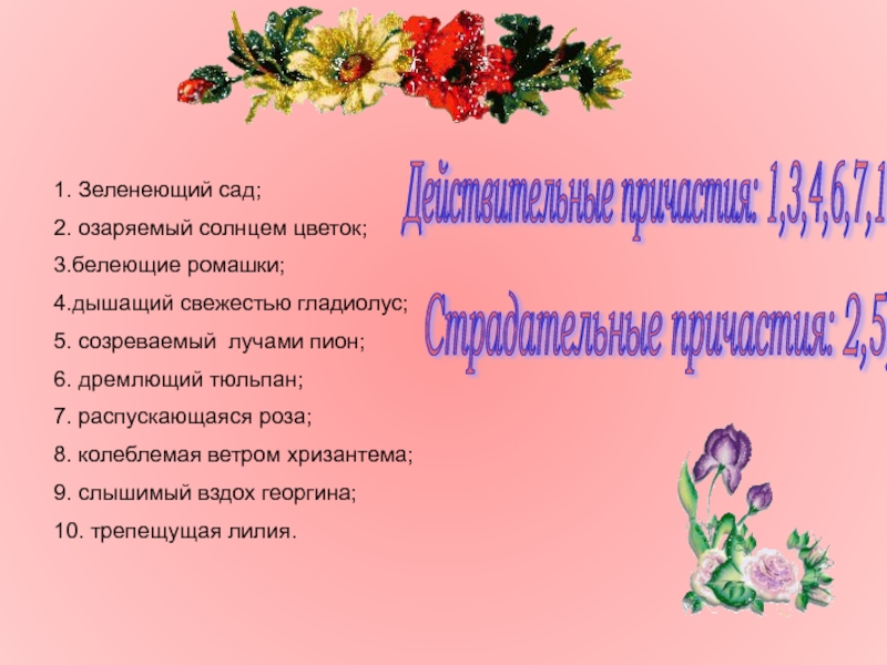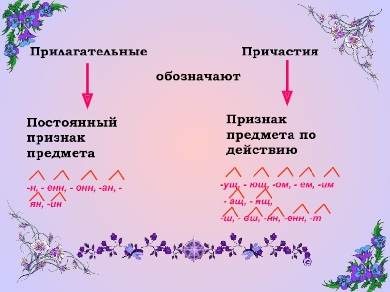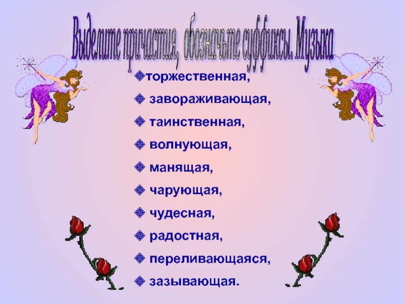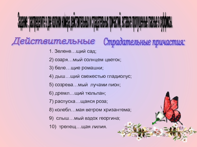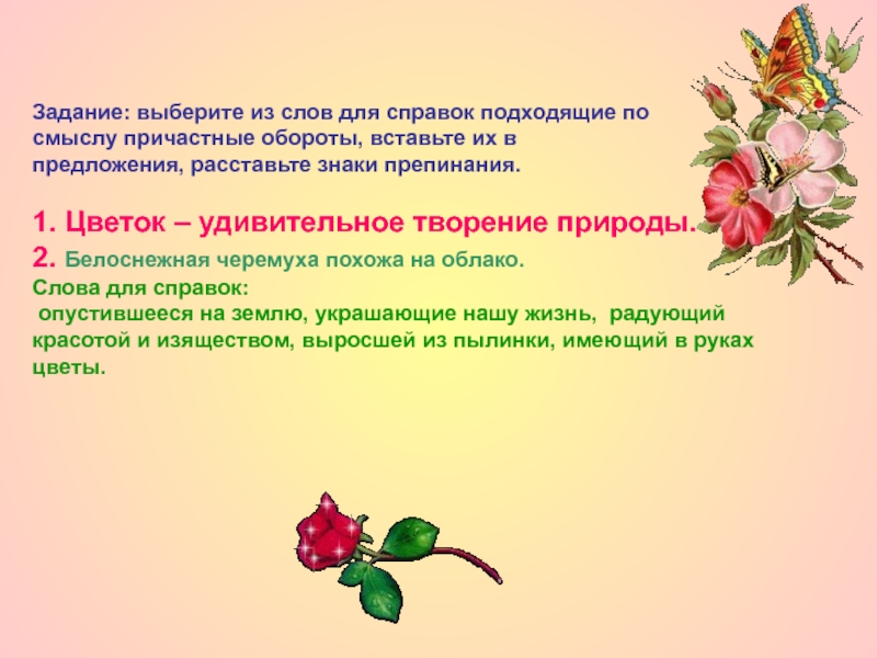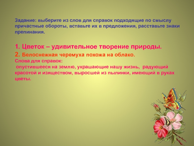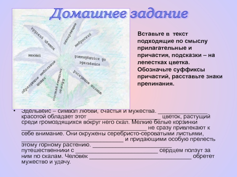 Вставьте в текст подходящие по смыслу прилагательные и причастия, подсказки – на лепестках цветка.