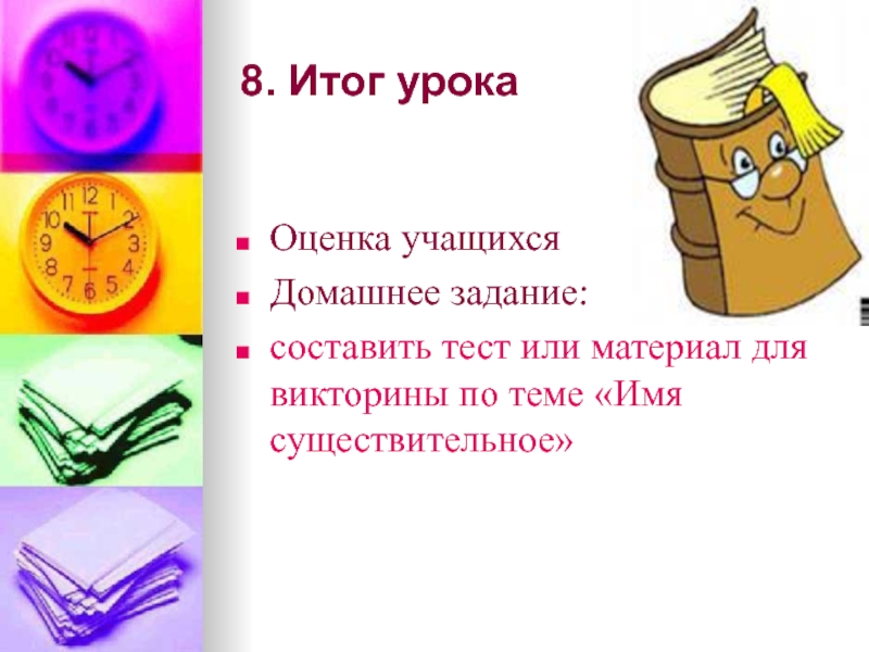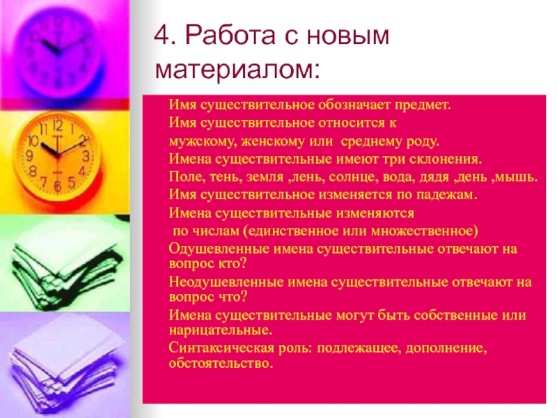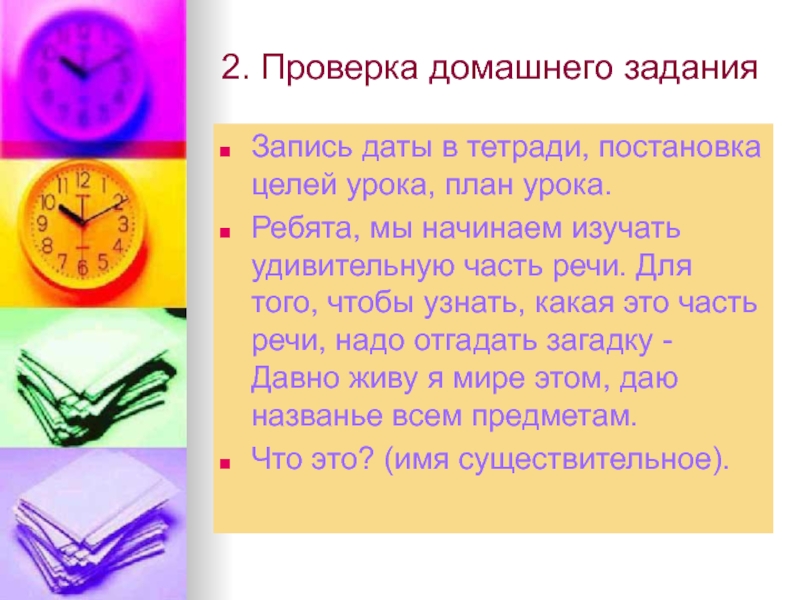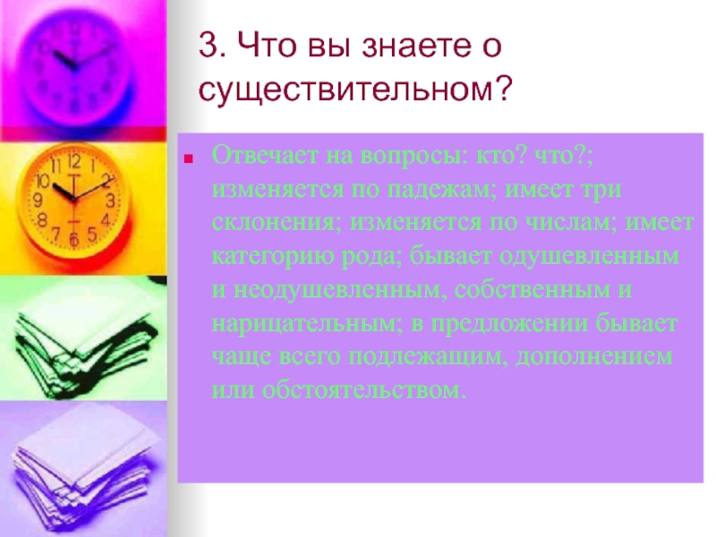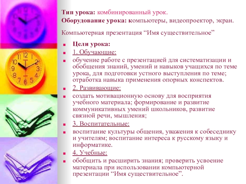 обобщить и расширить знания; проверить усвоение материала при использовании компьютерной презентации “Имя существительное”.