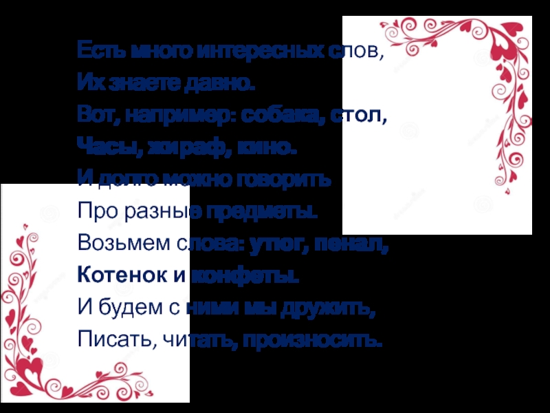 Есть много интересных слов,Их знаете давно.Вот, например: собака, стол,Часы, жираф, кино.И долго можно говоритьПро разные предметы.Возьмем слова: утюг, пенал,Котенок