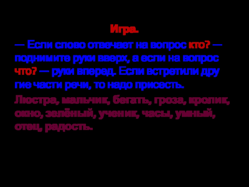 Игра.— Если слово отвечает на вопрос кто? — поднимите руки вверх, а если на вопрос что? — руки