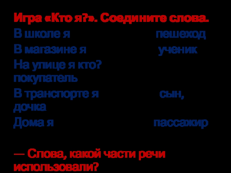 Игра «Кто я?». Соедините слова.В школе я
