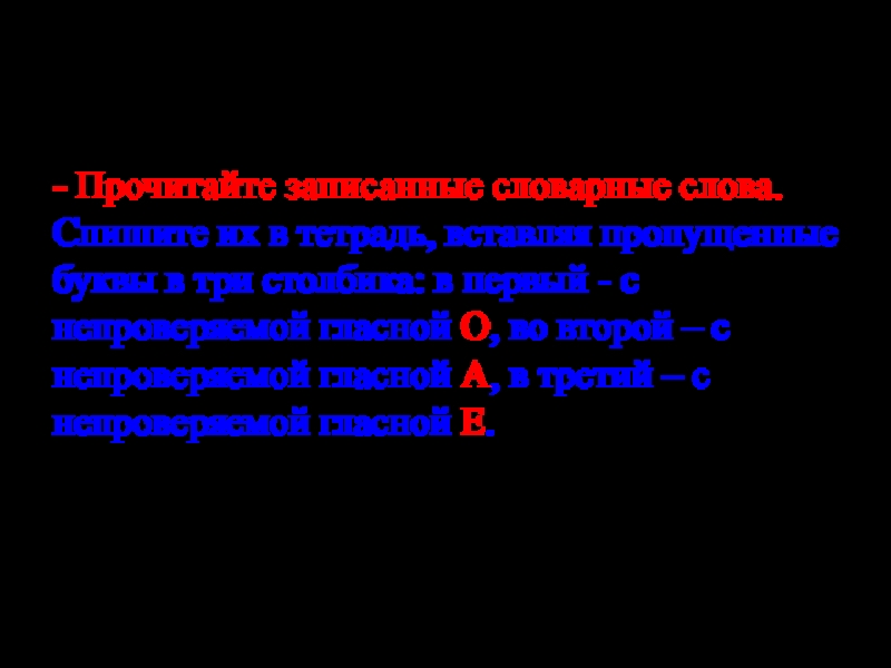 Слайд 7- Прочитайте записанные словарные слова. Спишите их в тетрадь, вставляя пропущенные