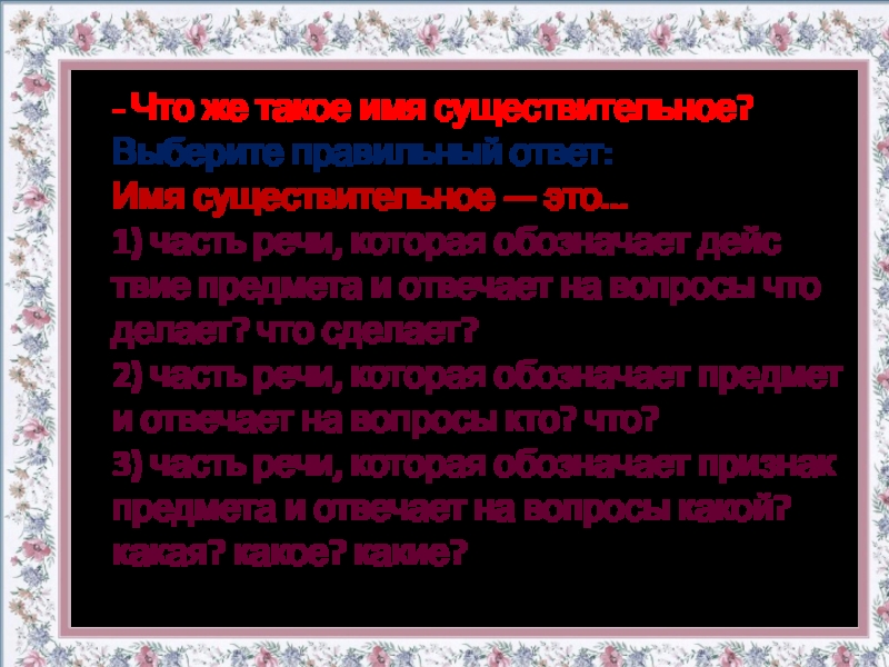 Слайд 11- Что же такое имя существительное? Выберите правильный ответ: