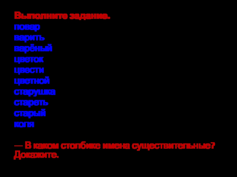 Выполните задание.поварваритьварёныйцветокцвестицветнойстарушкастаретьстарыйколя — В каком столбике имена существи­тельные? Докажите.