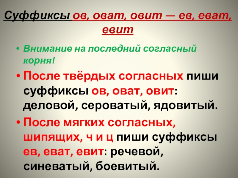 После твёрдых согласных пиши суффиксы ов, оват, овит: деловой, сероватый, ядовитый.