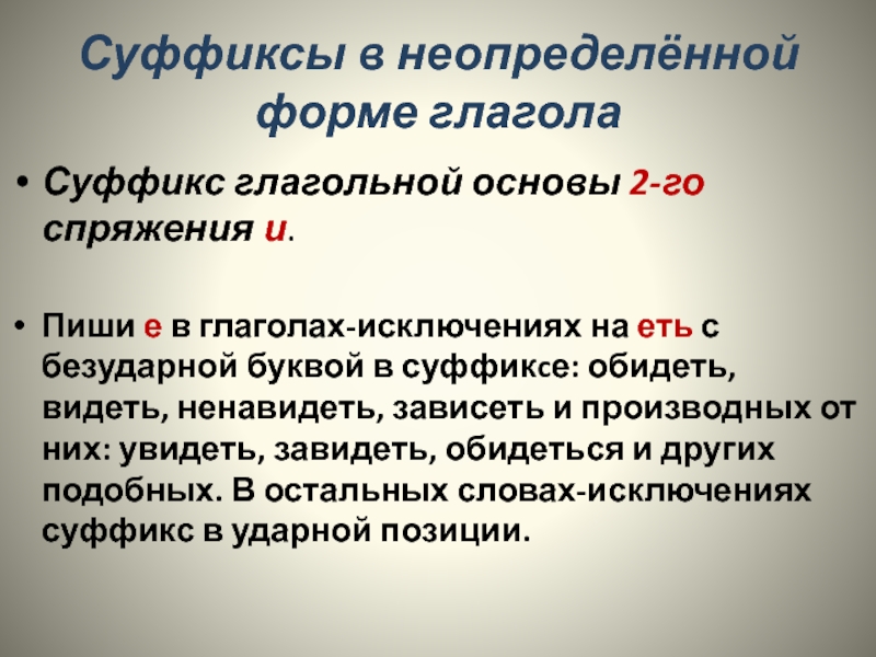 в глаголах-исключениях на еть с безударной буквой в суффикcе: обидеть, видеть, ненавидеть, зависеть и производных от них: увидеть, завидеть, обидеться и других подобных. В остальных словах-исключениях суффикс в ударной позиции.