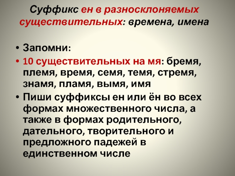 Слайд 15Суффикс ен в разносклоняемых существительных: времена, имена